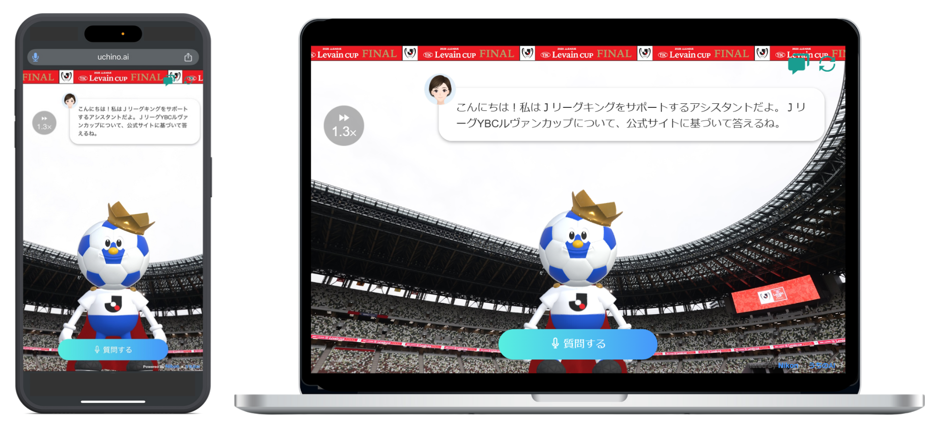 2025JリーグYBCルヴァンカップ決勝の特設Webサイト上で公開した「Jリーグキング」のAIアバター。ユーザーが音声を通してルヴァンカップ決勝に関する質問をすると、その質問に対して自然でわかりやすい回答を行います。