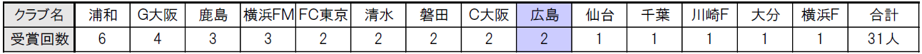 ■クラブ別ニューヒーロー賞受賞人数