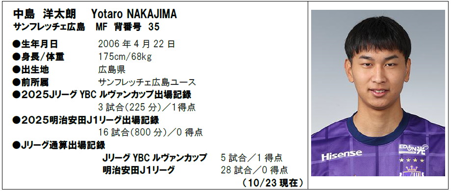 報道関係の皆様のご協力により1stラウンドから準決勝まで実施いたしました投票の結果をもとにJリーグにて協議した結果、2025JリーグYBCルヴァンカップ ニューヒーロー賞は、中島 洋太朗 選手(サンフレッチェ広島)に決定いたしました。