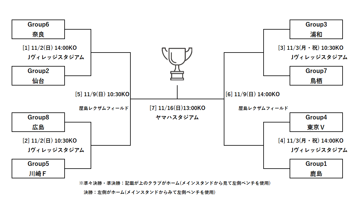 ノックアウトラウンドは11月2日(日)から開催し、決勝は11月16日(日)にヤマハスタジアムで行います。ノックアウトラウンドの組み合わせは以下の通りです。なおノックアウトラウンドの全試合は、Jリーグ公式YouTubeチャンネルで無料ライブ配信を行います。