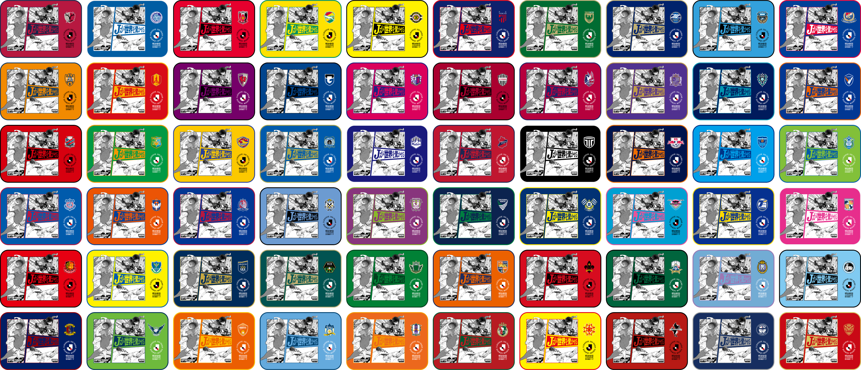 シュートを放つ3人の主人公たちの気迫と、Jリーグの改革の覚悟を伝えるコピーとともに、クラブそれぞれのカラーやエンブレムをあしらったデザインです。(全クラブ60種類に加え、Jリーグ版1種類の61種類)