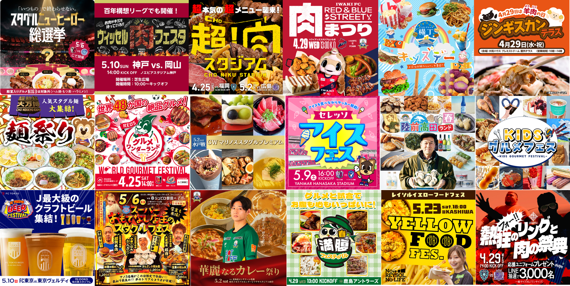 Jリーグでは、全国60クラブのスタジアムで毎試合スタジアムグルメ(通称:スタグル)がお楽しみいただけます。このたび、ゴールデンウィーク期間を中心に全国56か所のスタジアムで、肉まつりや麺まつりといったクラブ独自のテーマを設けたスペシャルグルメフェスの開催が決定しました。