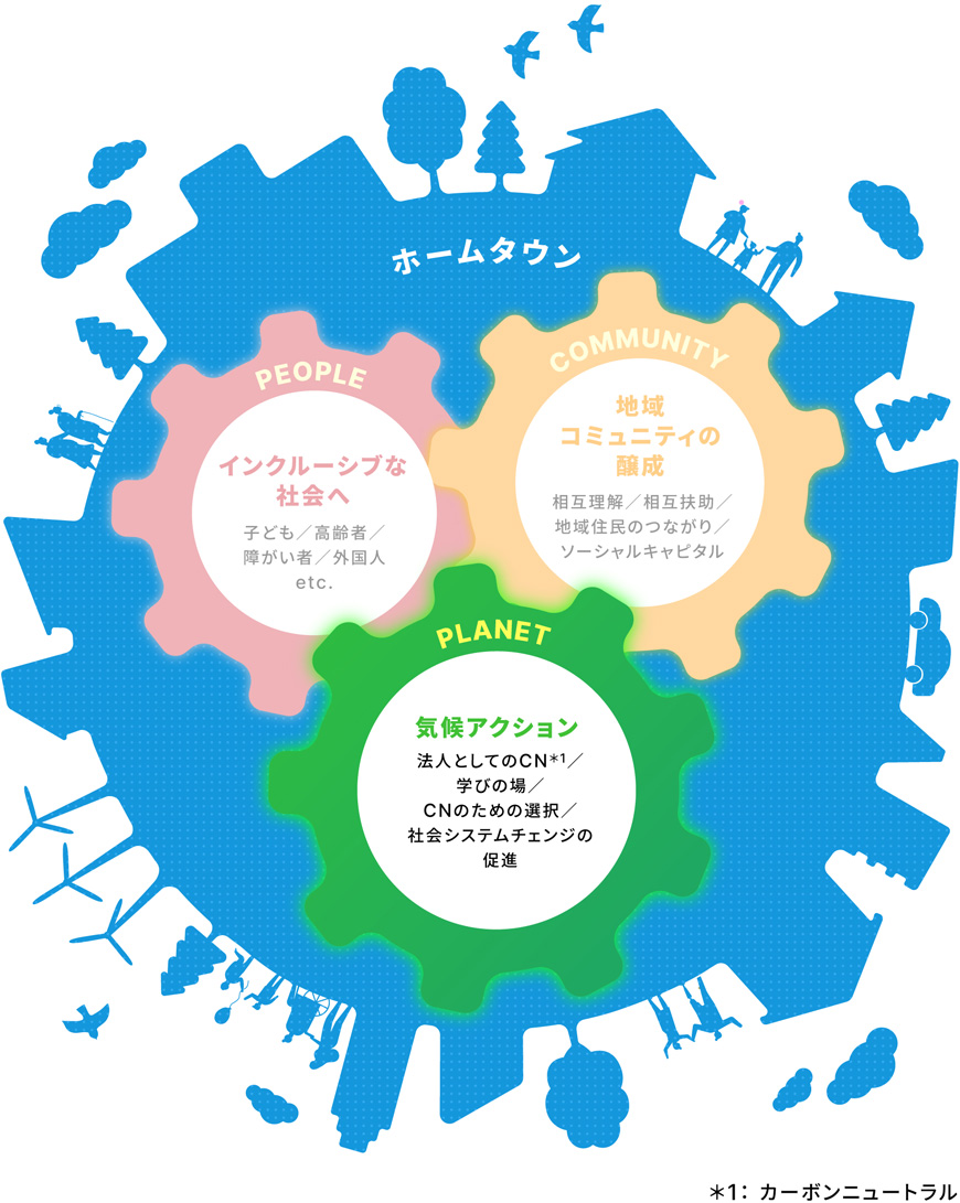 サステナビリティ領域での取り組みにおいては「地域コミュニティの醸成(COMMUNITY)」、「インクルーシブな社会へ(PEOPLE)」、「気候アクション(PLANET)」という3つの枠組みを定義し、Jリーグ・各クラブが活動している。