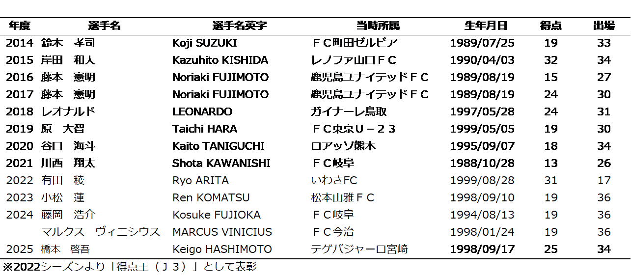 得点王(J3)※2 | FW | 橋本 啓吾 | テゲバジャーロ宮崎 | 初 |