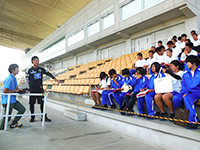 観客席でアルウィンを体感しながら片山ホームタウン担当兼プラスワンバサダーの話を聞く参加者のみなさん。