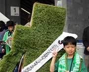 「ヴェルディは9番のフッキ選手に注目してください! ドリブルもシュートもすごいですよ」と武田さん。城さんも「マリノスは、日本代表でも活躍している山瀬功治選手に注目してください!! ドリブルもパスも本当に上手です」と試合の見所を伝えていきます。お二人の「どっちが勝つと思う?」という問いかけには「ヴェルディ!!」「マリノス!!」と子ども達から大きな返事が返ってきました。徐々に迫ってくるキックオフに、嬉しさと期待を隠し切れない様子です。