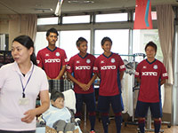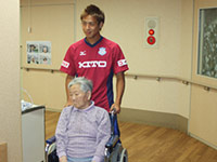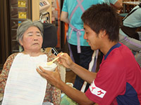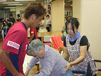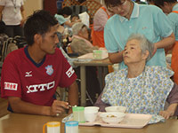 7月24日(水)、金子昌広選手、橋爪勇樹選手、河本明人選手、岡西宏祐選手の新人選手4名が、地域ボランティア活動の一環として山梨県笛吹市内にある「社会福祉法人 寿の家」にて高齢者の方々と交流しました。選手たちは高齢者の方が食事をする際に介助したり、車椅子での移動をお手伝いしたりする中で、普段何気なくしている食事や、移動についても、高齢者の方については難しさがあることをあらためて感じたようです。